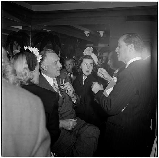 Champagne Cholly Book Party [Man and woman talking at the bar.]