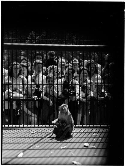 How People Look to Monkeys [Crowd looking at a monkey in a cage.]
