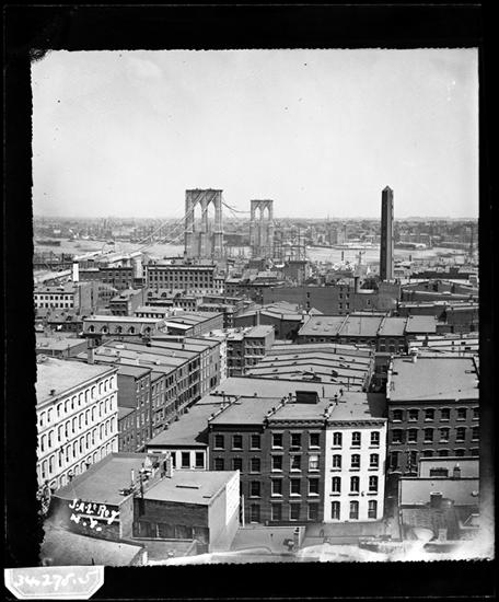 [Cityscape with Brooklyn Bridge under construction in background.]