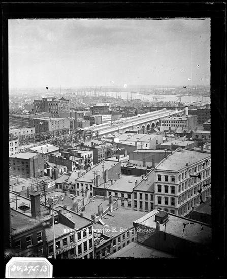 [Cityscape with Brooklyn Bridge under construction in the background.]