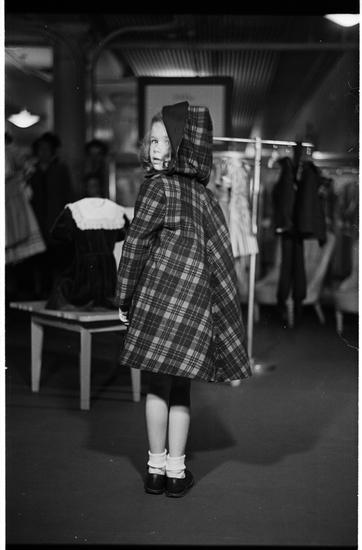 Clothes of Schoolchildren [Girl wearing a coat and a man in a children's clothing store.]
