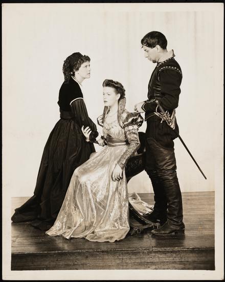 [Paul Robeson in the title role, Uta Hagen as Desdemona and Philip Huston as Lodovico in "Othello".]
