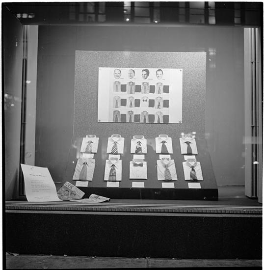 Abraham Strauss [Woman looking at shirts in a window display.]