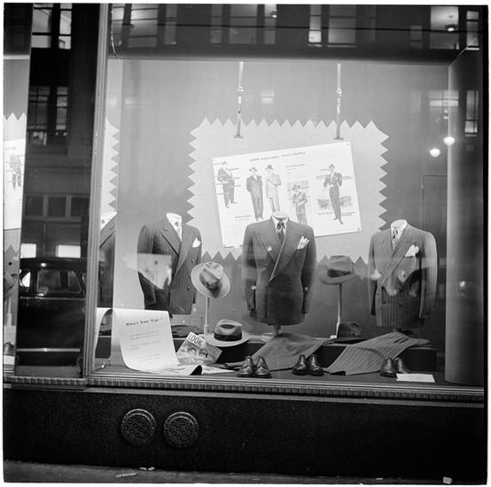 Abraham Strauss [Woman looking at shirts in a window display.]