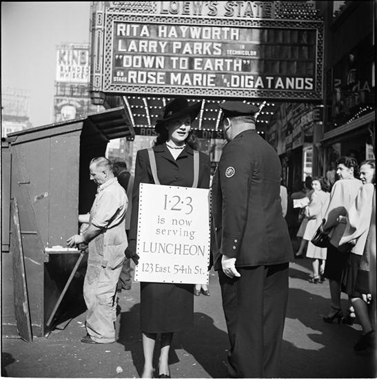 Advertising Sandwich Board [Woman wearing a sandwich board advertising the 1-2-3 cafe.]