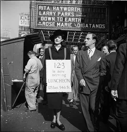 Advertising Sandwich Board [Woman wearing a sandwich board advertising the 1-2-3 cafe.]