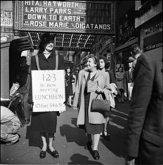 Advertising Sandwich Board [Woman wearing a sandwich board advertising the 1-2-3 cafe.]
