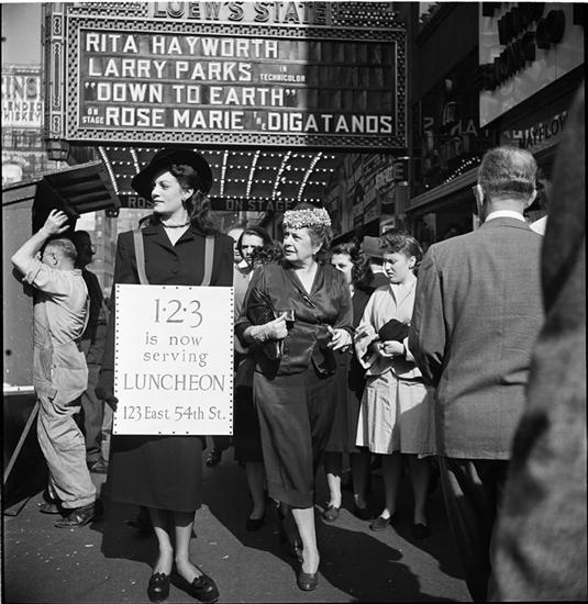 Advertising Sandwich Board [Woman wearing a sandwich board advertising the 1-2-3 cafe.]