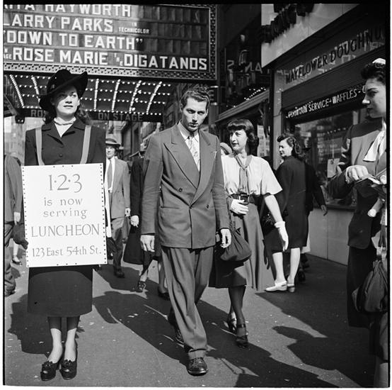 Advertising Sandwich Board [Woman wearing a sandwich board advertising the 1-2-3 cafe.]