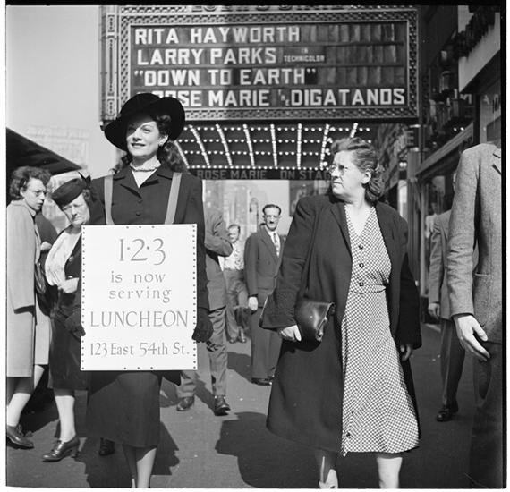 Advertising Sandwich Board [Woman wearing a sandwich board advertising the 1-2-3 cafe.]