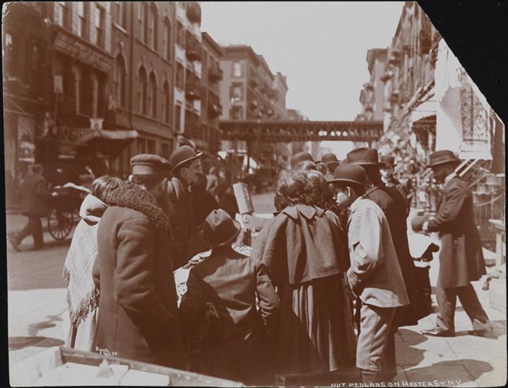 People crowded around a nut peddler on Hester Street; el visible beyond.