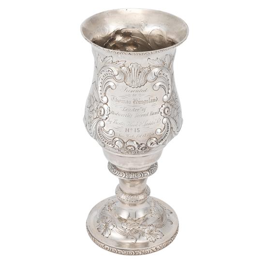 Double-bellied, tulip-shape, spun goblet with everted lip on ringed and domed circular foot, die-rolled borders at lip, juncture of stem with body and foot, band of chased raffled shells at juncture of foot and stem, and foot and body decorated with repoussé-chased floral motifs and cartouche of scrolls and shells. Inscription: Engraved within reserve on body: "Presented/to/Thomas Kingsland/'Leader' of/Dodworth's Second Band/by Baxter Hook & Ladder Co./No. 15/New York, Oct. 13, 1856". Mark: Struck on underside of bowl inside stem: "F.W. COOPER/MANUFACTURER".
