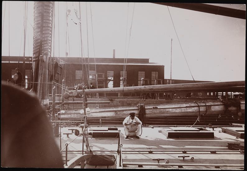 A crew member sitting on the deck of the yacht "Valkyrie".