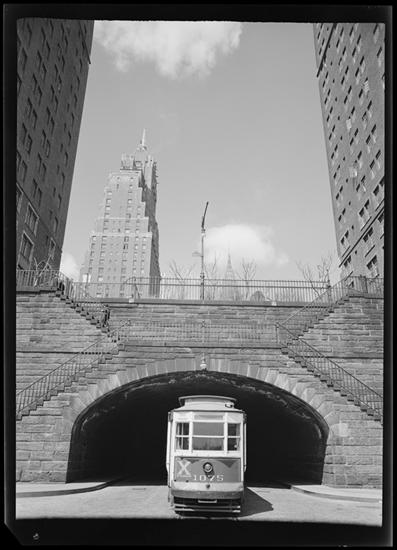 East 42nd Street. View looking west towards Tudor City from 1st Avenue and 42nd Street, at part of arch, stairs, etc.