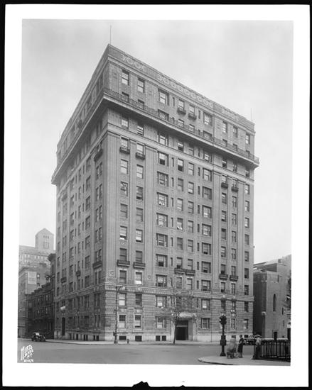 98th Street at the S.E. corner of West End Avenue. Apartment house.
