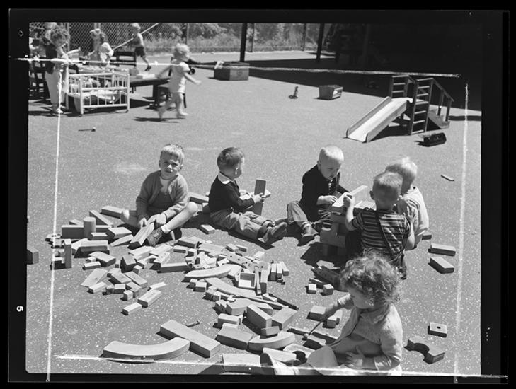 Phipps's Housing, children, boys, children's playground, "Toy War Tank," children, girls "house keeping" sand box.