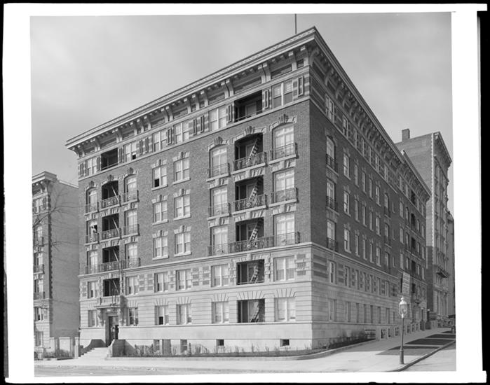 115th Street at the S.W. corner of Morningside Avenue. Apartment house.
