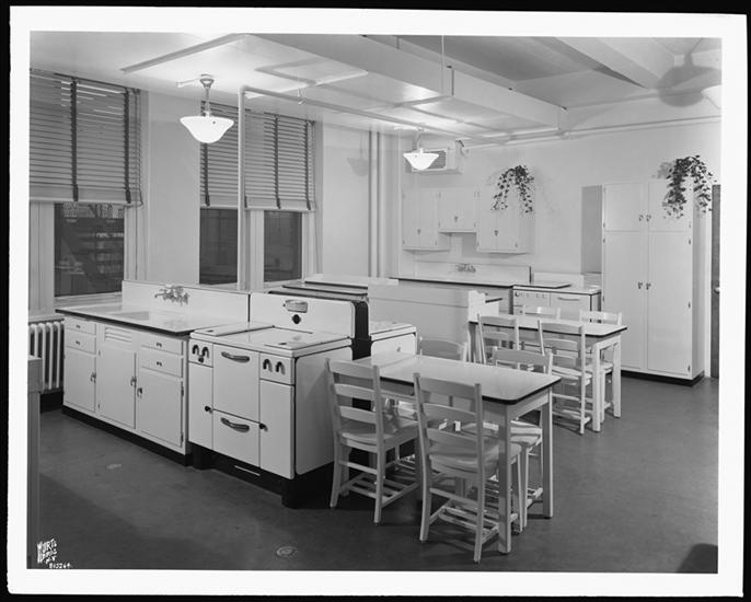 New York University, Home Economics Department, cooking equipment in classrooms, detail view of Room 1079 in the Education Building.