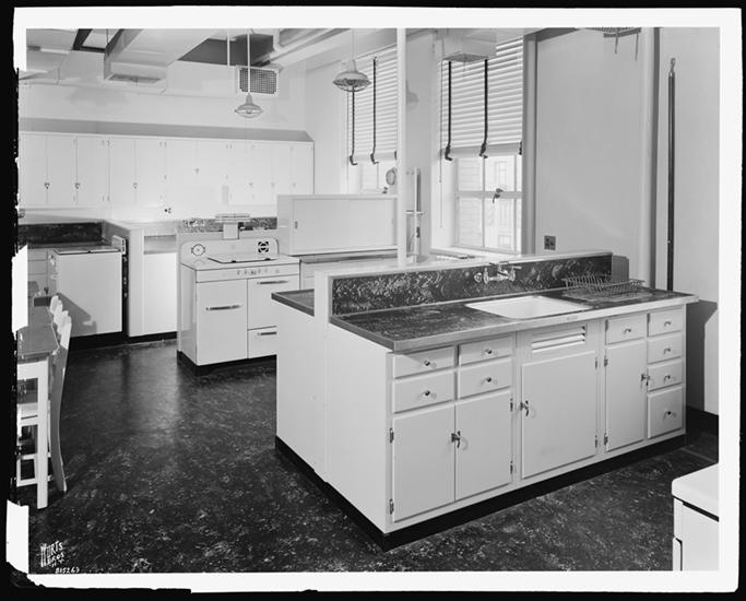 New York University, Home Economics Department, cooking equipment in classrooms, view of one side of Room 1080 in the Education Building.