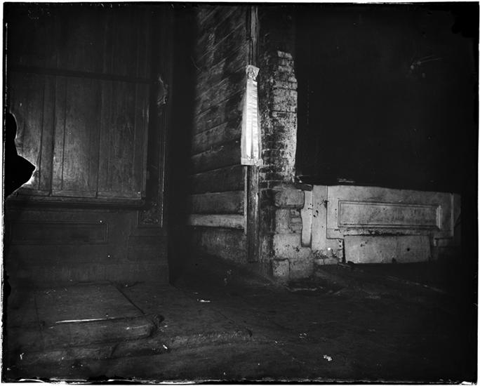 Bottle Alley Mulberry Bend in its worst days, picture used as evidence in murder case -- cross on stairs shows where murderer stood and did shooting.