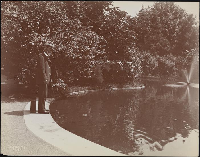 A man standing by a pond at Sailor's Snug Harbor, a facility and home for retired sailors on Staten Island, New York.