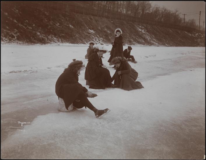 People preparing to ice skate on a frozen lake at McComb's Dam.