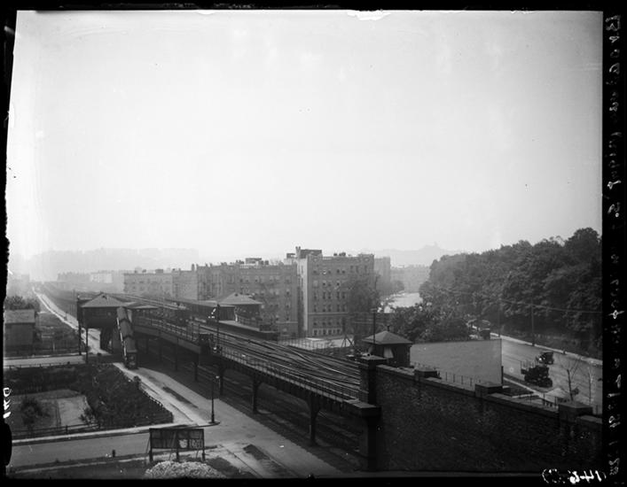 Broadway Series. Looking north from the roof of the 3rd Avenue (Kingsbridge Division) car barns. Where Broadway converges with 10th Avenue, at 218th Street, and the subway (elevated at this point) con