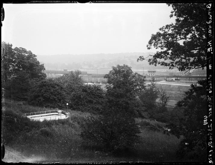 Broadway Series. View looking south from Arden St. Curve in road. Gas tank in center. Barrels near road at left. Grass in foreground. Heights in distance.