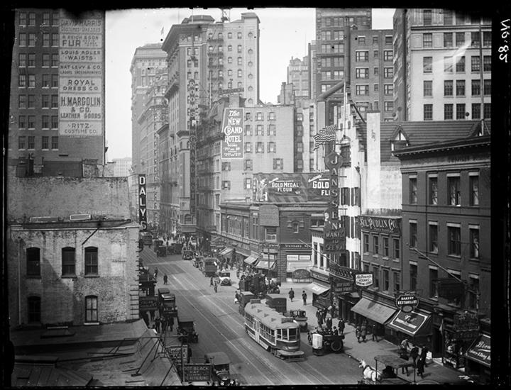 Broadway Series. View looking south from 31st Street (taken from 2nd floor window) showing east side of Broadway. The Grand Hotel is seen at left corner. Hofbrau House (Janssen's) is seen in middle di