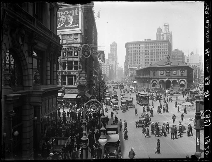 Broadway Series. View looking north from 32nd Street (Greeley Square), where Broadway crosses 6th Ave. McAlpin Hotel at right (on 34th Street). 6th Ave El Station at left, back of which is Saks Dept S
