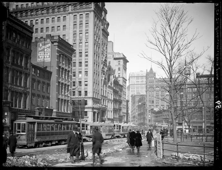 Broadway Series. Bway looking north toward Cedar Street. Picture taken while standing in front of Trinity Churchyard. Entrance to Trinity Building at left.