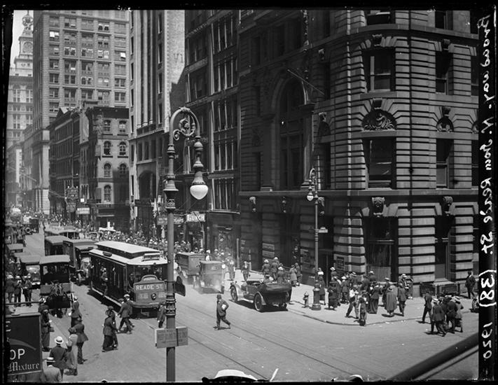 Broadway Series. View of west side of street, looking south from Dey and John Street. Taken from 2nd floor fire escape near Fulton. Waterman Pens or corner of Dey Street at right. Bolt & Co. (Diamonds