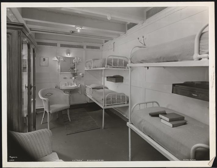 French Line, S.S. "Paris" Pier 88 N.R., Third Class, Interior, Inside 4 Berth Cabin #821.