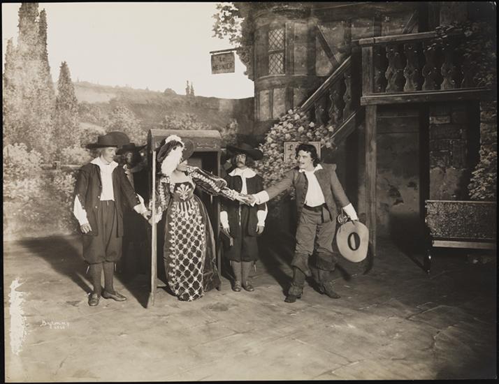 A scene from Sydney Grundy's play "The Musketeers" featuring James O'Neill as D'Artagnan, presented at the Broadway Theatre in 1899.