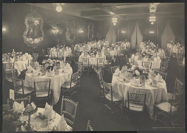 Banquet room filled with tables set for the dinner given to Mark Twain in honor of his 70th birthday at Delmonico's.