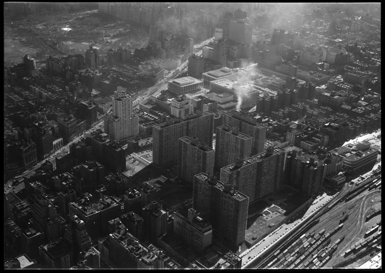 Aerial bird's-eye view of whole Upper West Side from about 65th Street looking due north [showing] Lincoln Towers in bottom center.