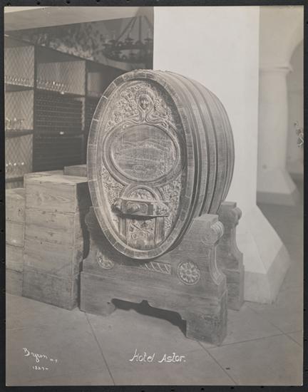 Close-up of a wine barrel in the rathskellar/wine cellar at the Hotel Astor, Broadway and 45th Street.