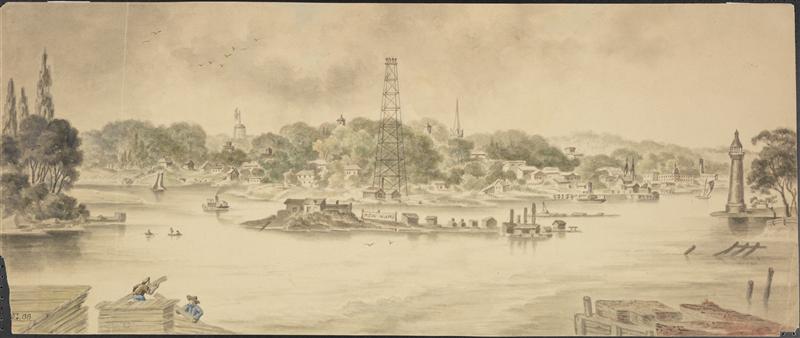 [Harbor, unidentified building from a park; shore of an unidentified lake.]
