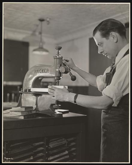 Unz & Co., Printers and Stationers, Second Floor, Man Working on Overlay at Press.