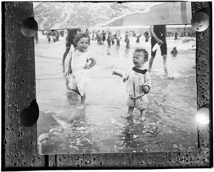 [Young children in the water and on the beach.]