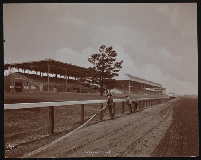 Men working on a fence, grand-stands beyond, at Belmont Park Race Track, Elmont N.Y.