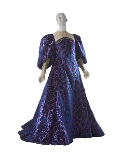 Gown in dark blue satin brocaded with red roses and white stemmed flowers