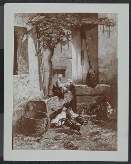 Photograph of a painting of chickens in a yard; signed but illegible.