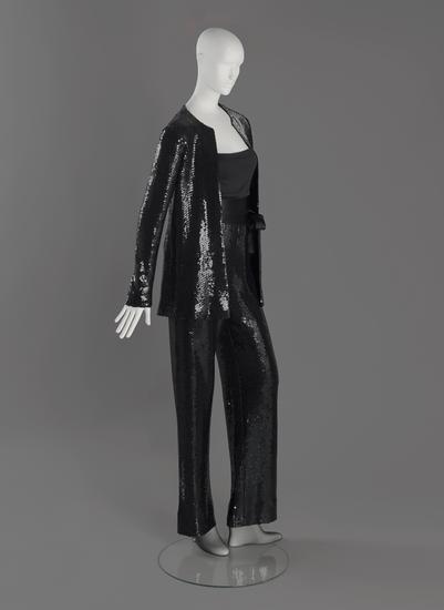 "Smoking" evening ensemble comprising tuxedo-style jacket and pants and black silk chiffon blouse