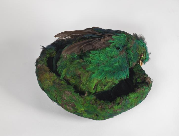 Fixed fan of feathers and small taxidermied bird