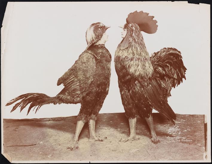 [Maude Adams adjusting an actor's costume for "Chantecler".]