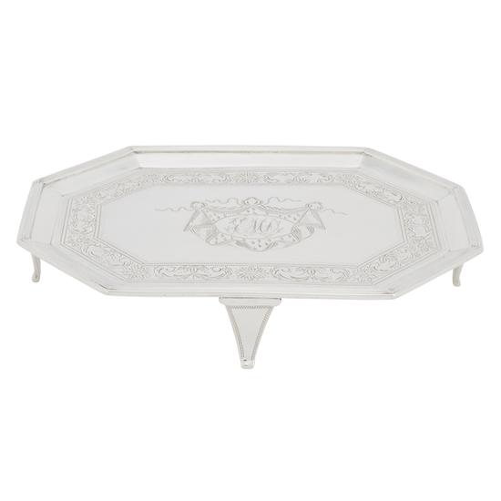 Teapot stand with elongated octagonal form, four bracket or French feet outlined with engraved wriggle work and engraved with bright-cut foliate scroll bands and bright-cut and engraved cartouches of draped ermine mantling. Inscription: Engraved within mantling: EMD. Mark: Struck on base in two sizes of Roman caps: Bayley / [profile of eagle head.]