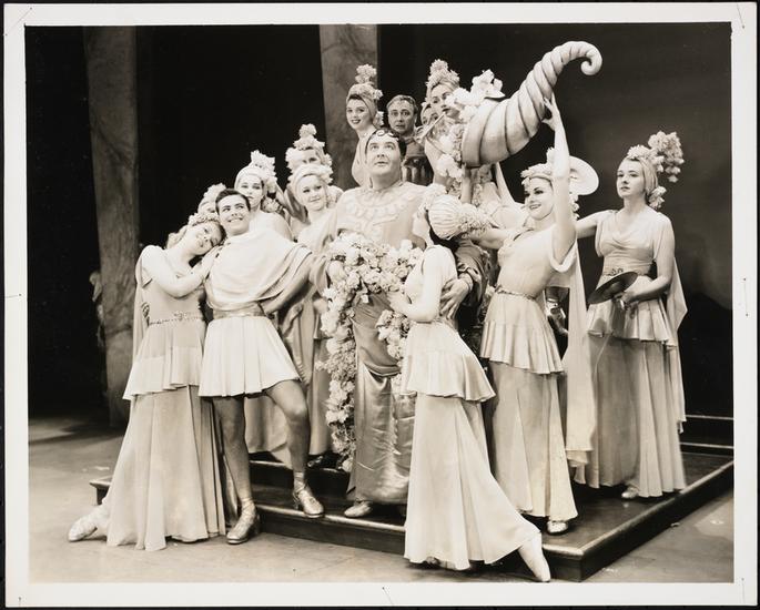 [Ernest Truex as Menelaus, Jarmila Novotna as Helen, and William Horne as Paris in "Helen Goes to Troy".]