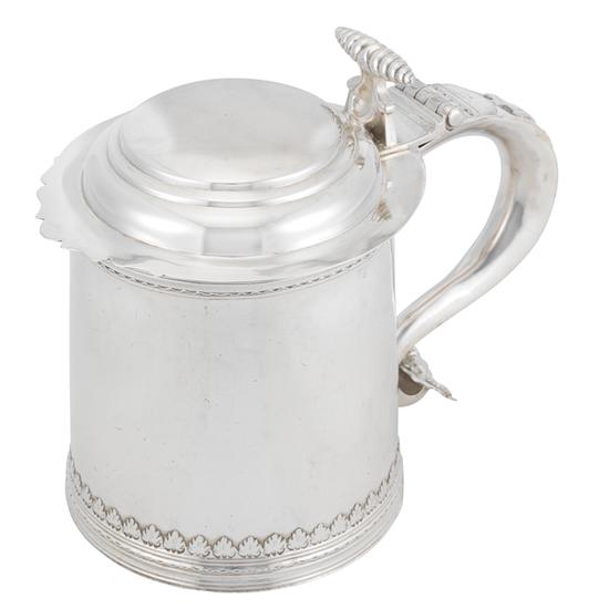 Tankard with raised circular body, straight tapered sides, two-step molded rim with meander wire, applied base molding with inset band of meander wire below stamped foliate cut-card band, raised and soldered hollow S-curve handle with cast lion couchant applied to upper handle base, cast five-knuckle hinge between bands of meander wire, applied engraved leaflike form on handle back below hinge, handle terminal with cast cherub's head mask applied to shaped shield, raised circular two-step cover with flat top, and cast cocoon thumbpiece (1951 replacement). Inscription: Engraved on the handle: "S/I*E" Mark: Struck three times on the body: "C K" in Roman caps in rectangle- to left of handle at rim, to right of handle below rim, and next to handle (faint).