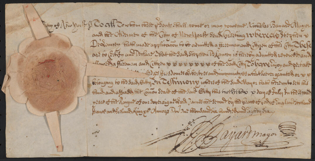 Certificate issued by Mayor Robert Lurting on behalf of the Aldermen of the City of New York to James De Lancey, admitting him as a freeman, February 11, 1730